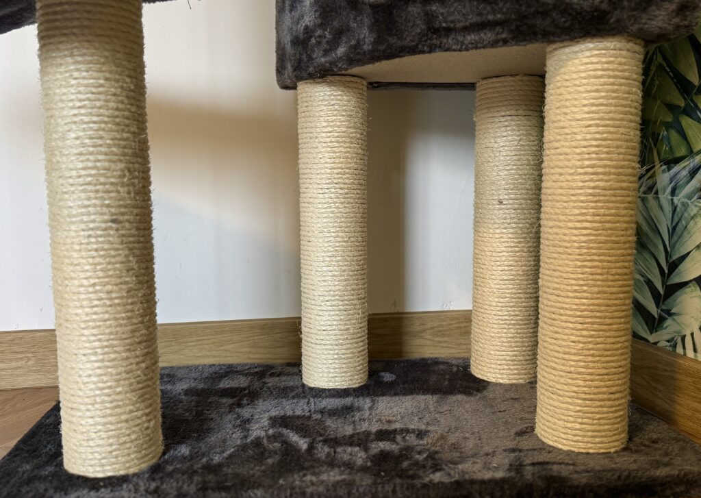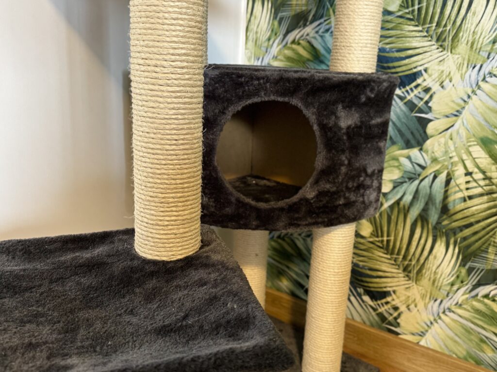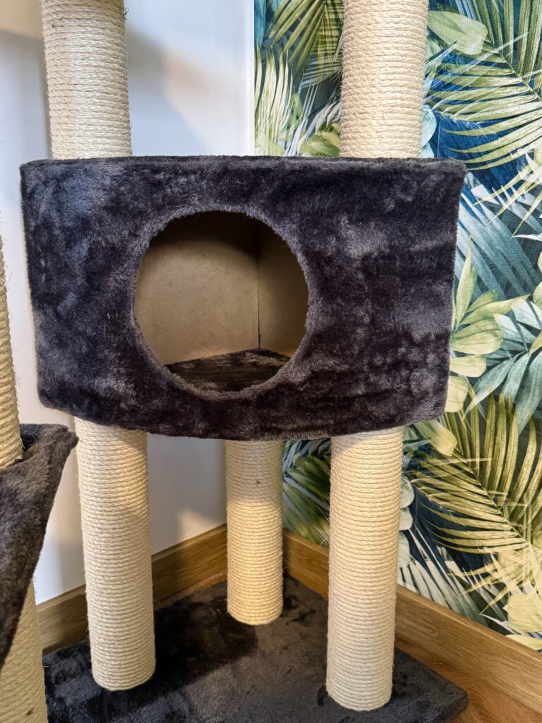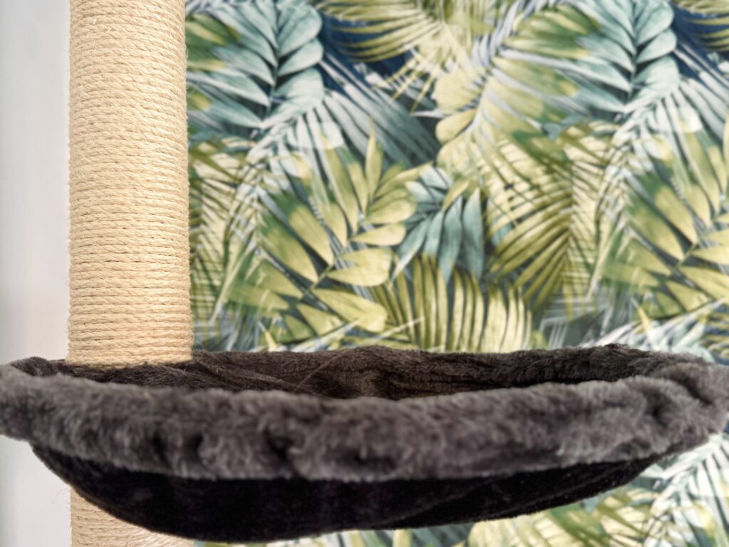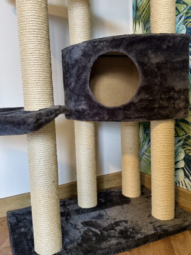 Wyposażenie: drapak do wspinania z półkami o wysokości 2,5 m2, legowisko, kuweta, miseczki na wodę oraz karmę suchą i mokrą