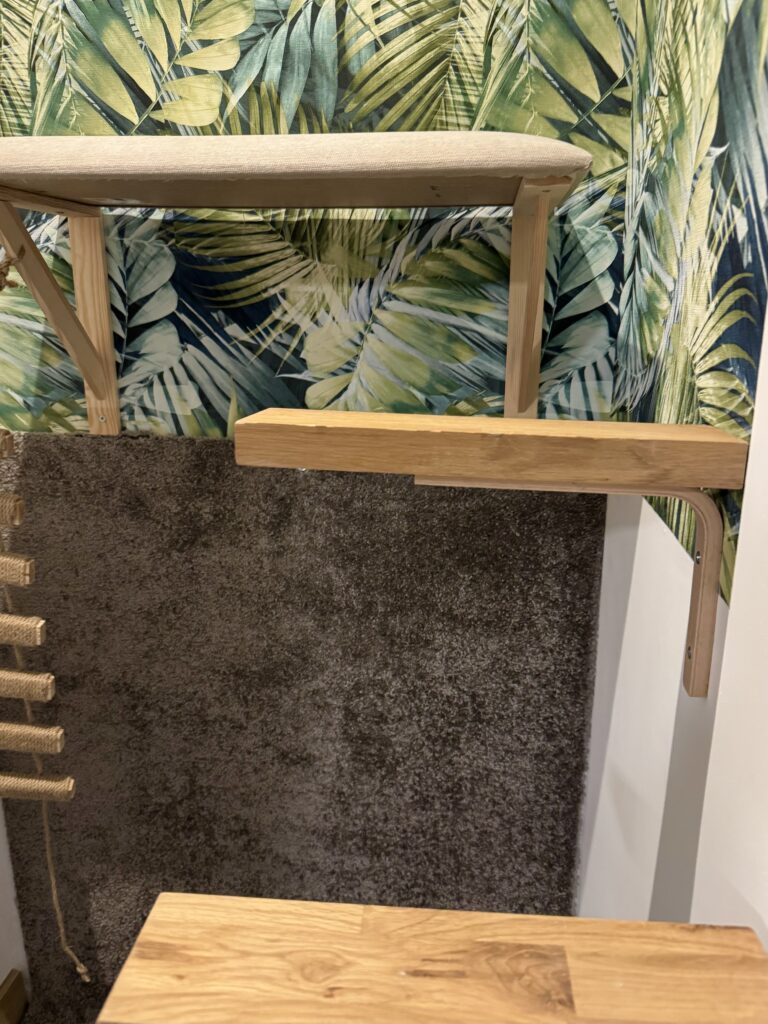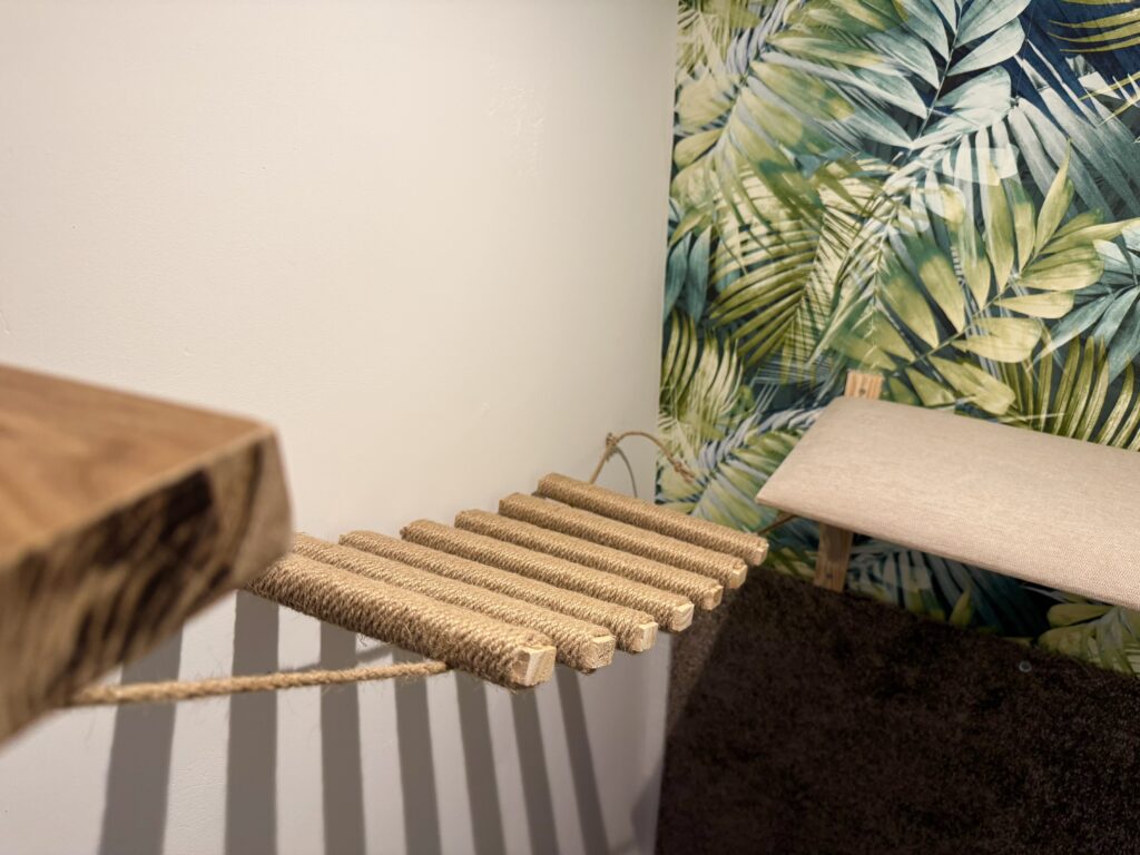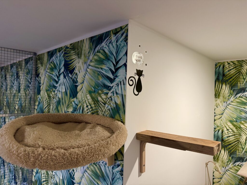 Wyposażenie: drapak do wspinania z półkami o wysokości 1,5 m2, legowisko, kuweta, miseczki na wodę oraz karmę suchą i mokrą