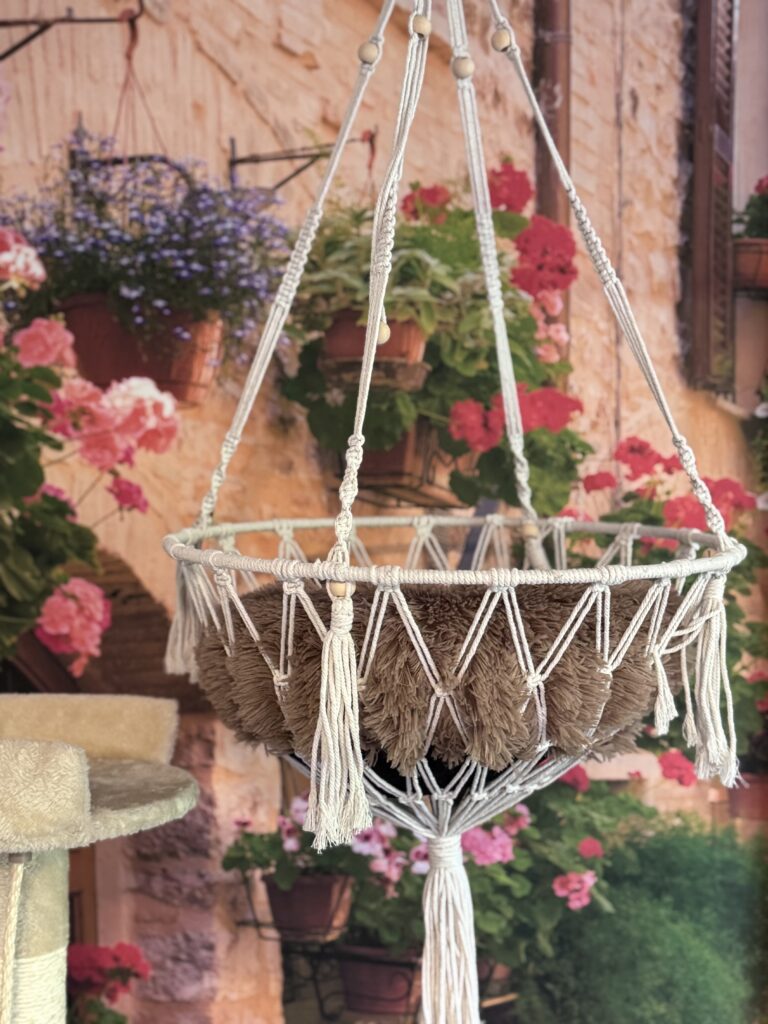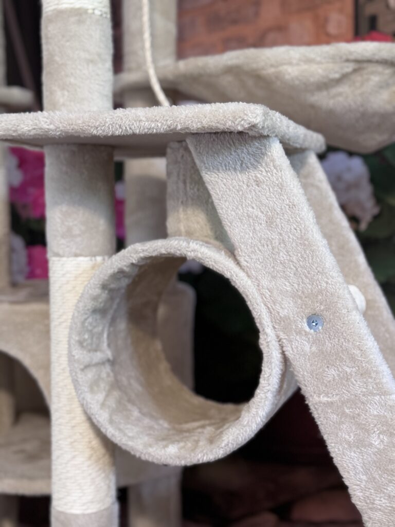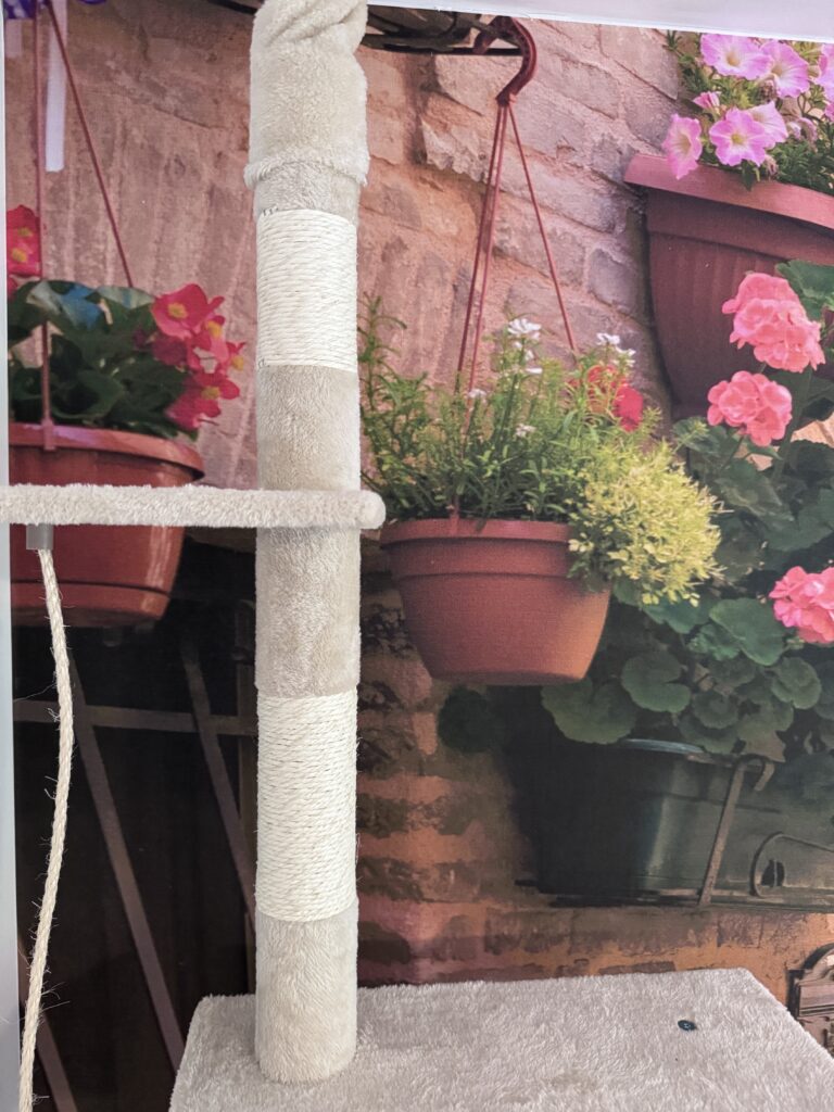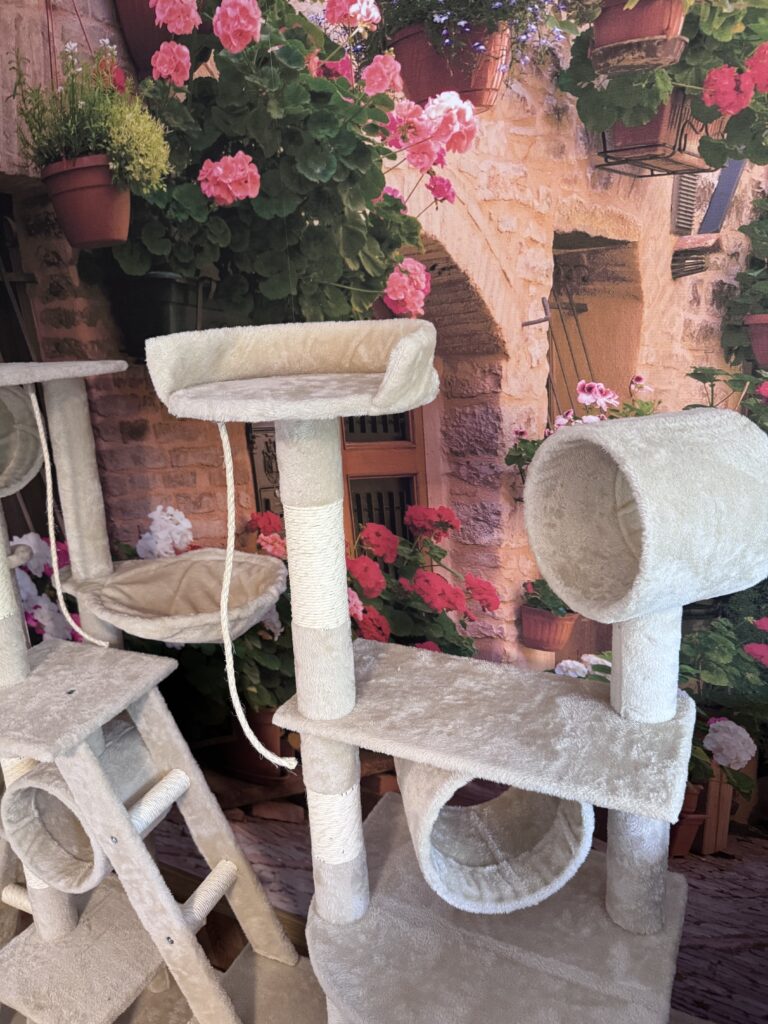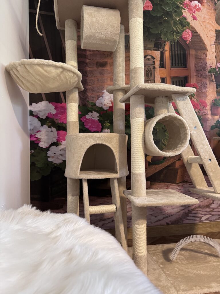 duży, podwójnu drapak do wspinania z półkami o wysokości 2,5 m2 z mnóstwem zakamarków, legowisko, huśtawka z mięciutką poduszką, pośrednio widok na ogród, kuweta, miseczki na wodę oraz karmę suchą i mokrą