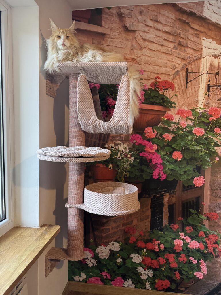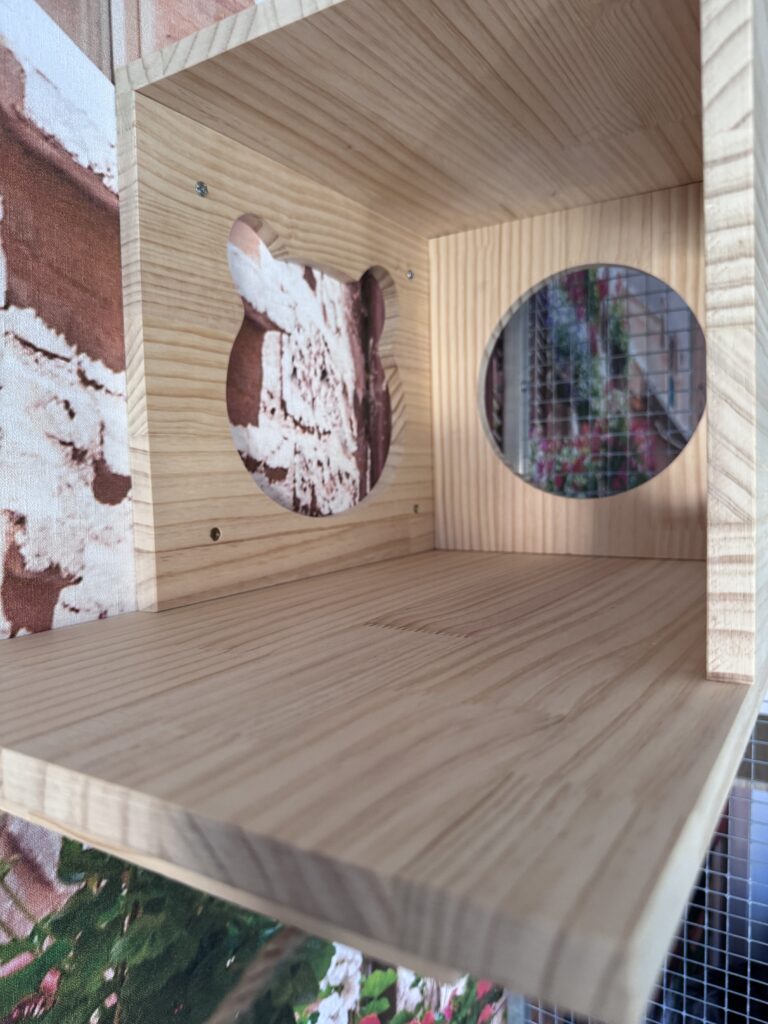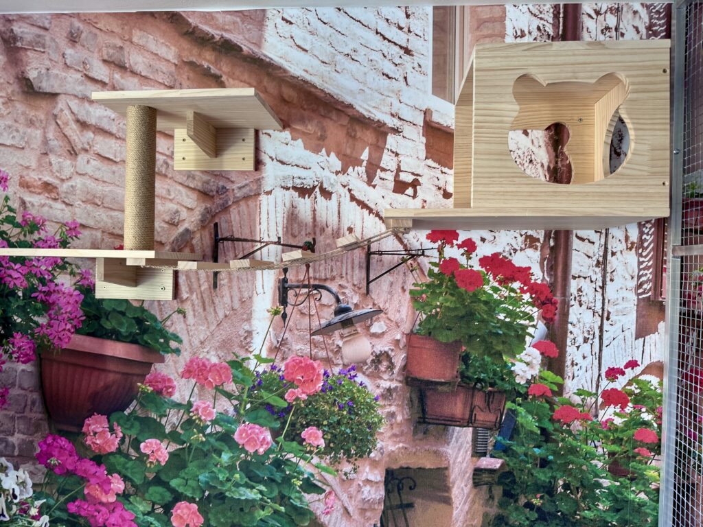 Wyposażenie: drapak do wspinania z legowiskami, półeczki do wspinania z domkiem, kuweta, miseczki na wodę oraz karmę suchą i mokrą