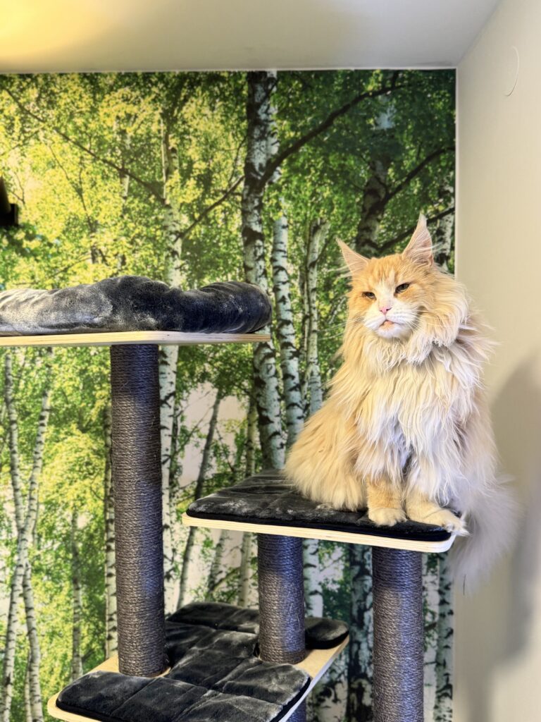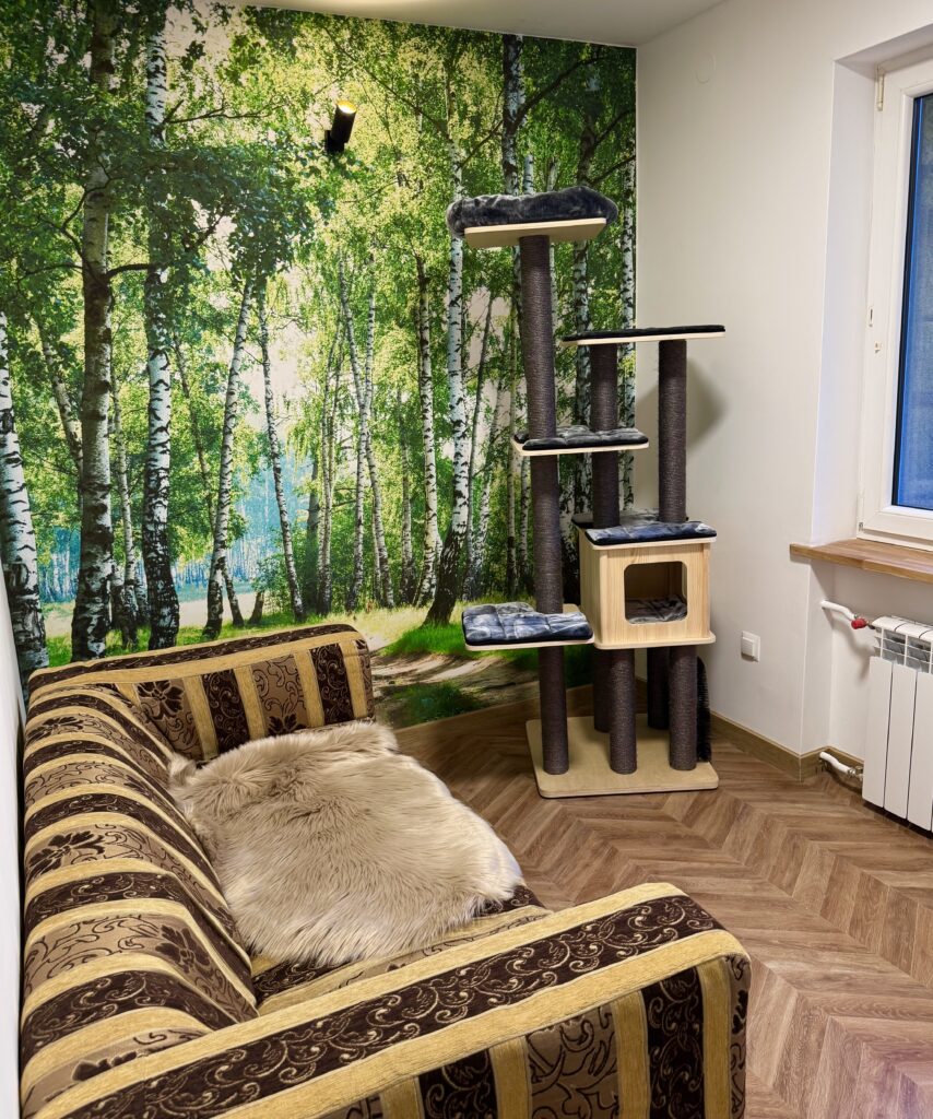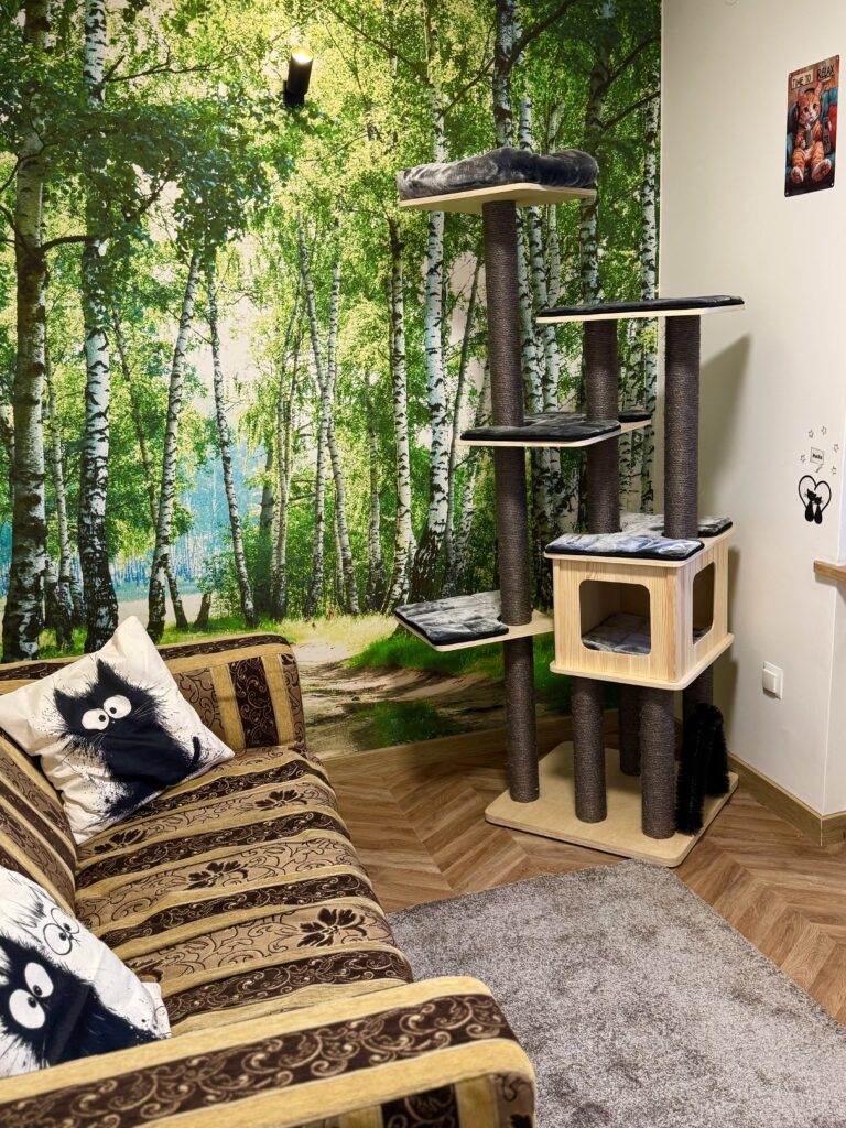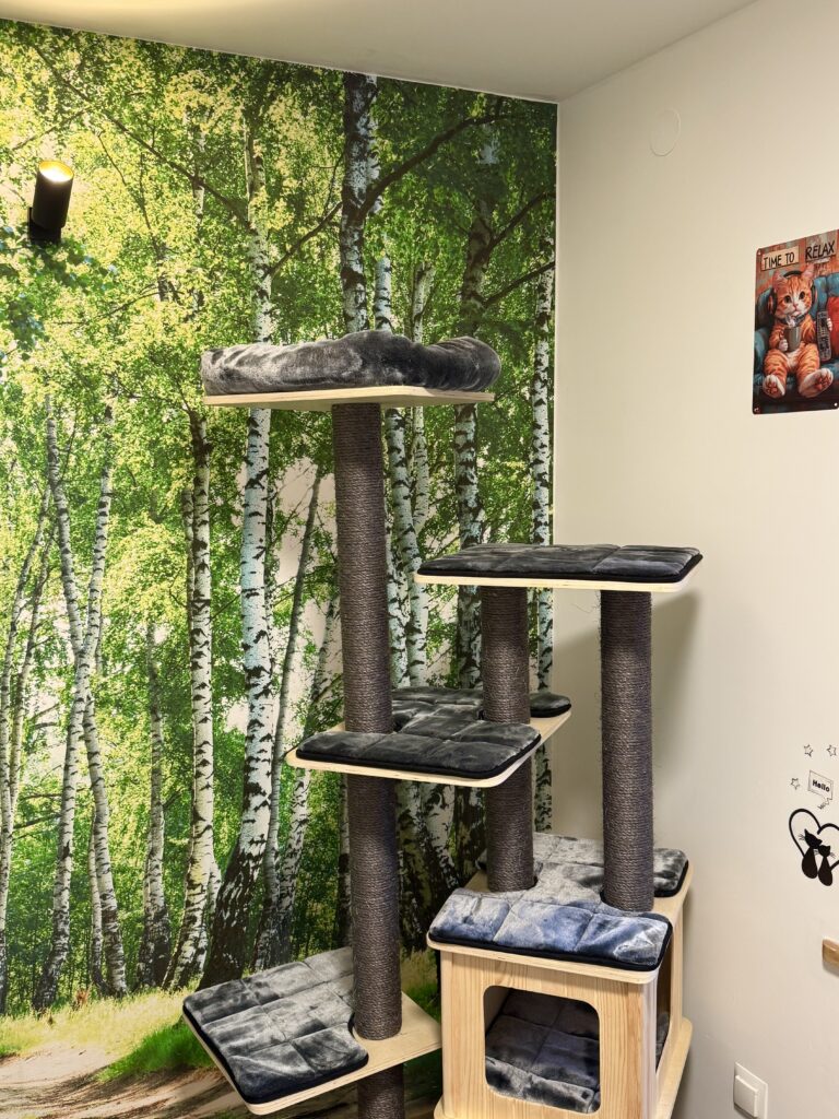 Wyposażenie: drapak do wspinania z półkami o wysokości 2,5 m2, legowisko, kuweta, miseczki na wodę oraz karmę suchą i mokrą
